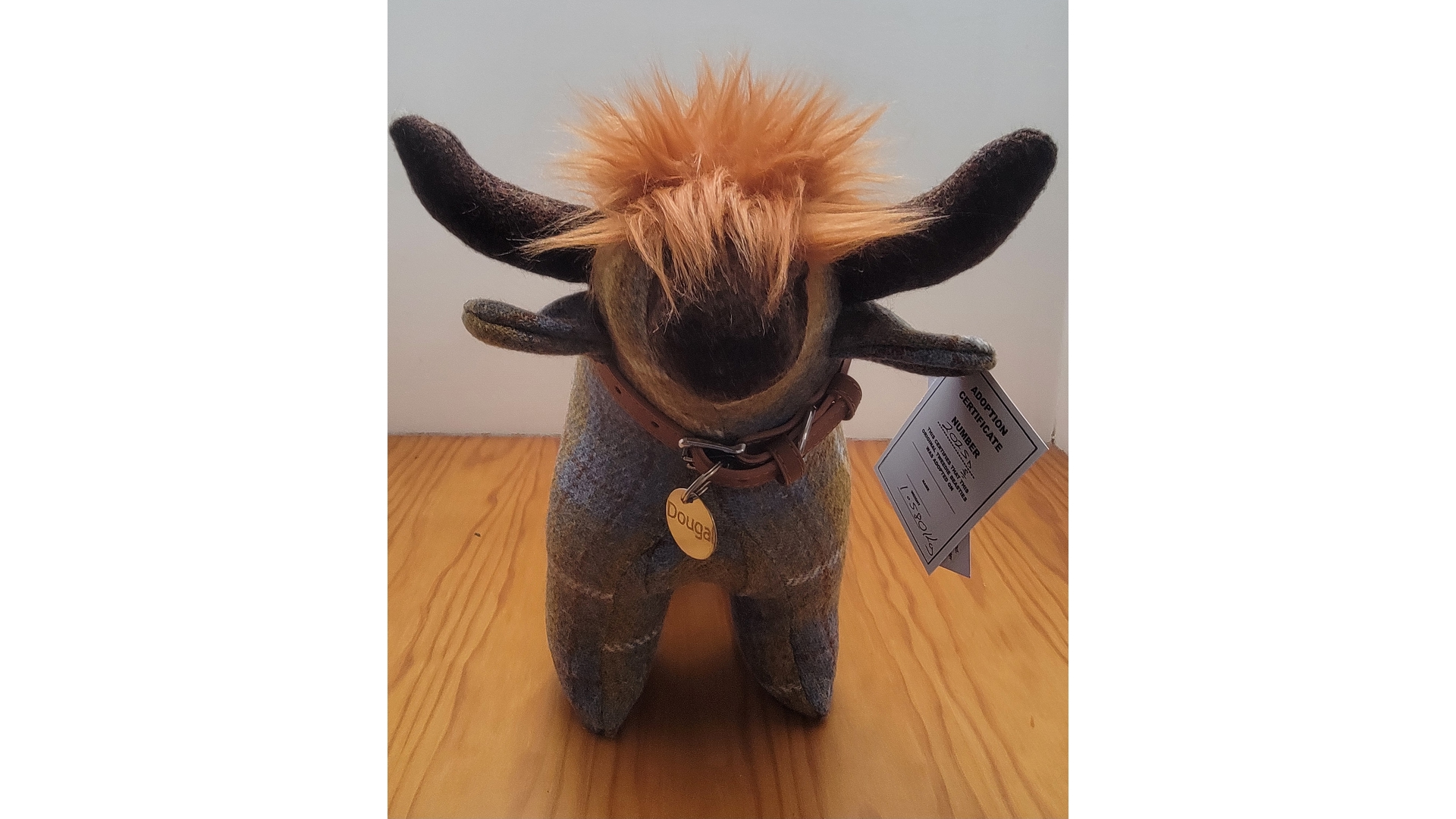 He is just so adorable and popular! Harris Tweed Highland Coo with collar and name. He is quite heavy and can be used as a doorstop or just to love! He is filled with fire retardant hollowfibre filling and kiln dried sand in his feet. I do a variety of colours so if you have a colour in mind, please email me for the options. He comes with collar and name tag - choose the name from the drop down list. Please choose a tweed from the drop down list. Size 23cm high to middle of back, 34 cm long from nose to bum. Made to order so please allow time to get made. I can make in your own material but it must be of sufficient quality (tartan needs to be medium weight upwards). Please note there is no discount for using you own material as it takes me longer to make.