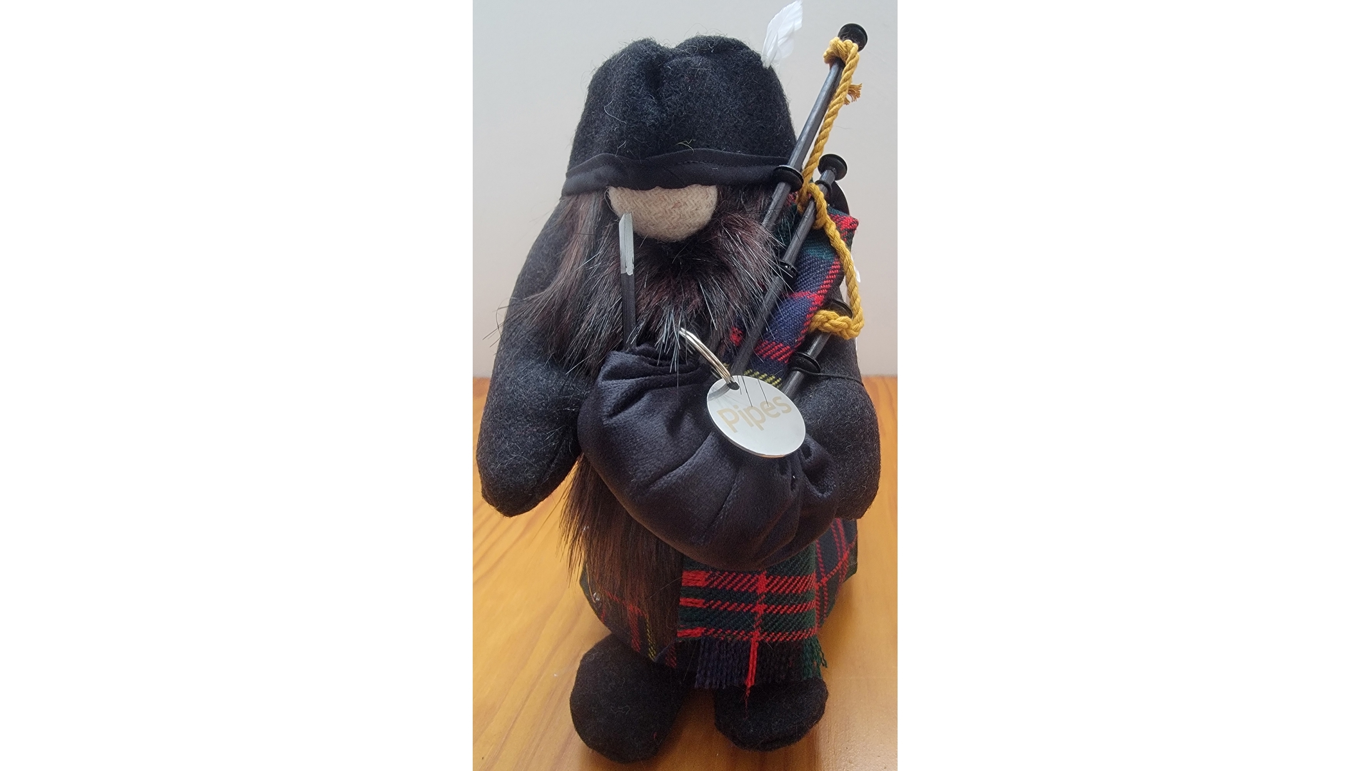 Hand made in Ballater. Piper Gnome. Every part of this is hand made, right down to the bagpipes. I only have a small selection of tartans and can't buy in a specific one as it's not cost effective. However if you can supply the tartan I can make it! Comes with either a glengarry or a feather bonnet (made of faux fur!) Height is 30cm, width 15cm (not circumference)